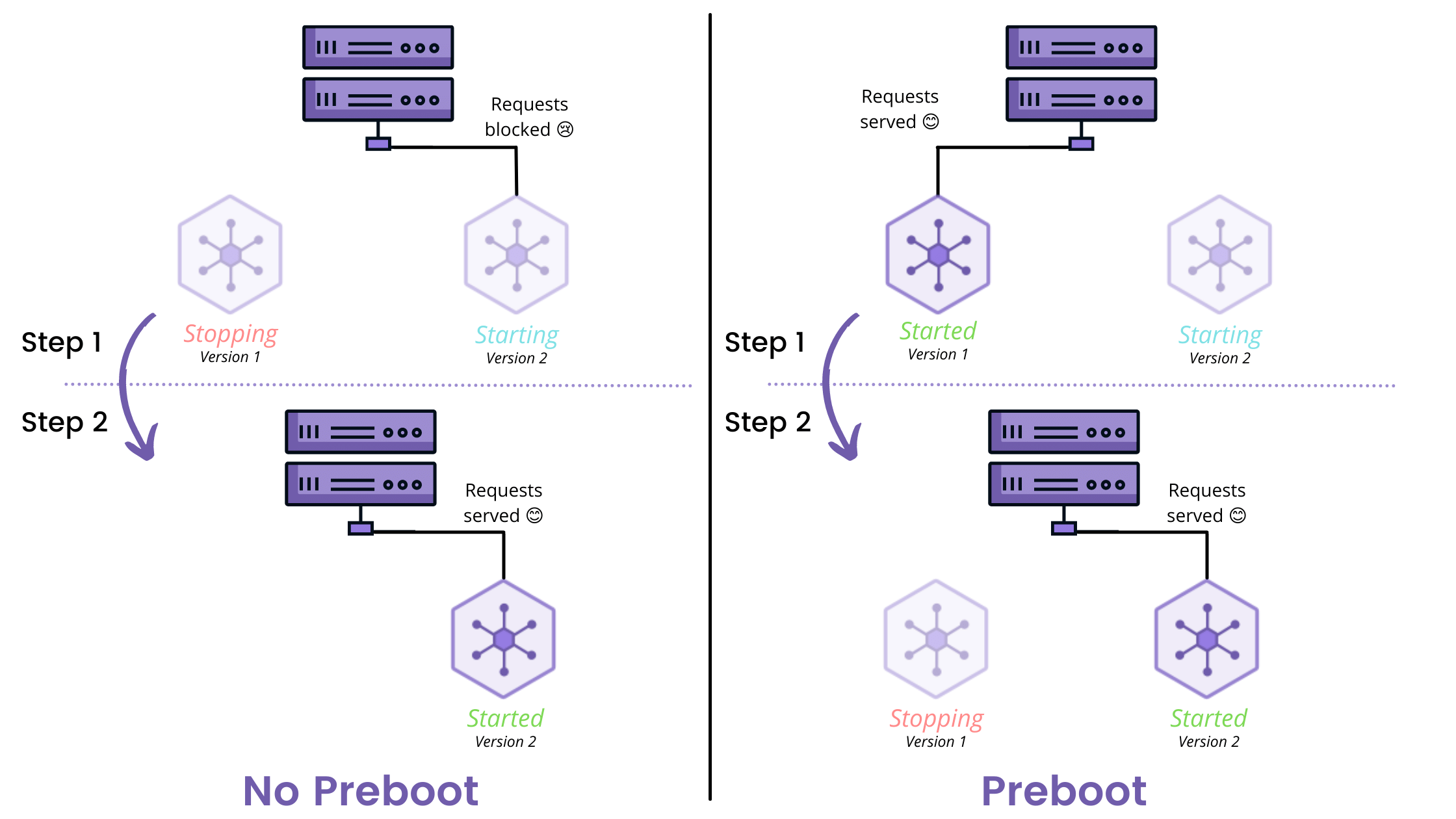 When not using the preboot features (the default), Heroku will stop and start your dyno simultaneously, switching the routing of the web requests to the starting dyno. This means there is a short time range where your request can be blocked, and the transition from one version to another of your application is not seamless.