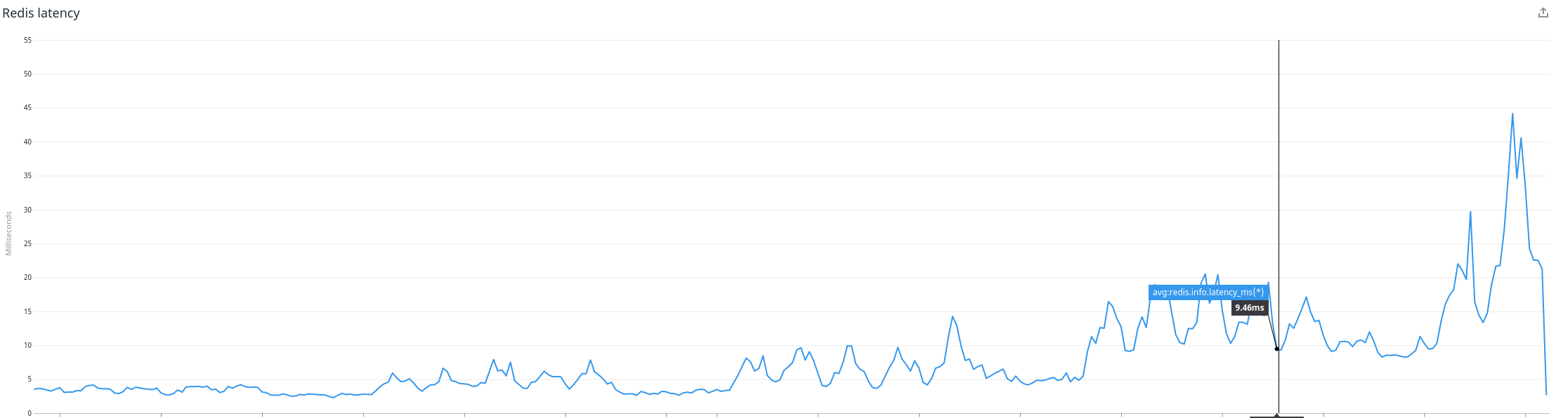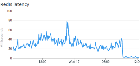 The Redis latency started to grow, drifting from a couple of milliseconds to 10x that.