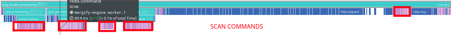 The SCAN usage made sense. The data layout for the latest merge queue feature was simple: each merge queue had its own set of Redis keys. The engine would use the Redis SCAN command to list the merge queues as needed. However, we didn't plan for so many SCAN commands being run and taking so much time.