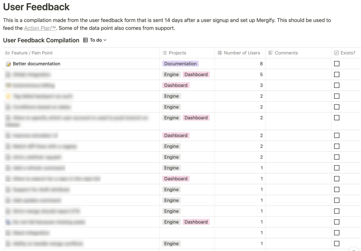 We use Notion to generate the table, but any other tool (e.g., Google Sheets or Trello) would work as well. We increment the number of times that we encounter the issue or request in the Number of Users column. This gives a rough estimation of how a particular point might be painful might. Right now, the #1 issue reported by users is our documentation, far above everything, as you can see by the number of points. That is the next item on our roadmap.