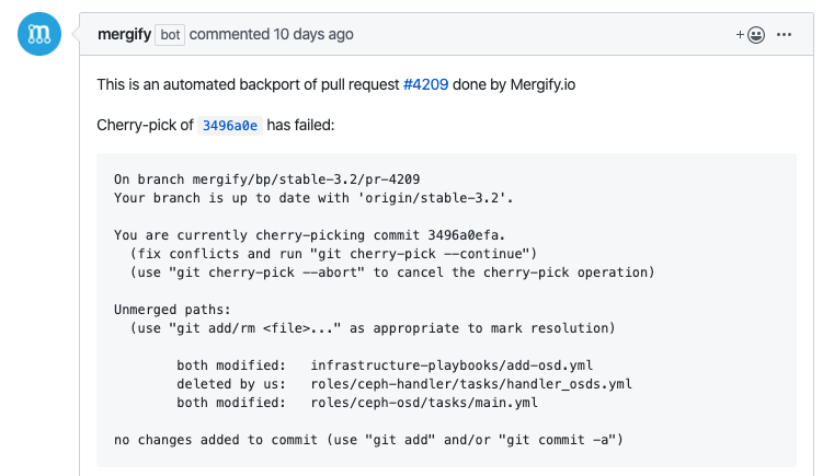 First, Mergify will not create a pull request with conflicting data if the cherry-picking of the commits fail. Instead, it will signal that creating the pull request failed in the check result. This should prevent creating pull requests which have no more value than what a human would do.