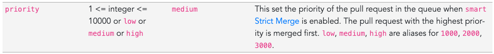 dependabot(a bot that updates your dependencies), it will be moved at the end of the merge queue. - Finally, a human-written pull request that is not a hotfix will have a medium priority and get merged before the bot updates, but after any hotfix.