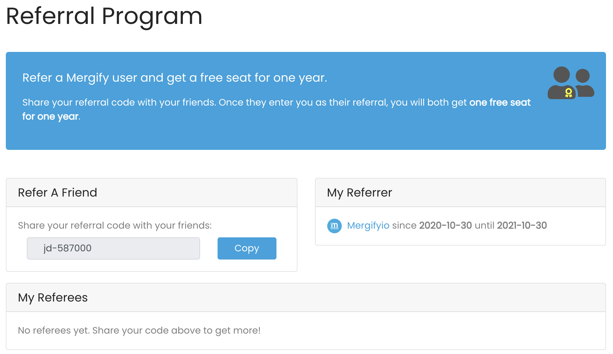 Considering this, it only seemed fair to us to reward those recommending users. We've now introduced a referral program to Mergify. This program allows you to refer your friends and be rewarded both by one free seat for one year for any of our plans.