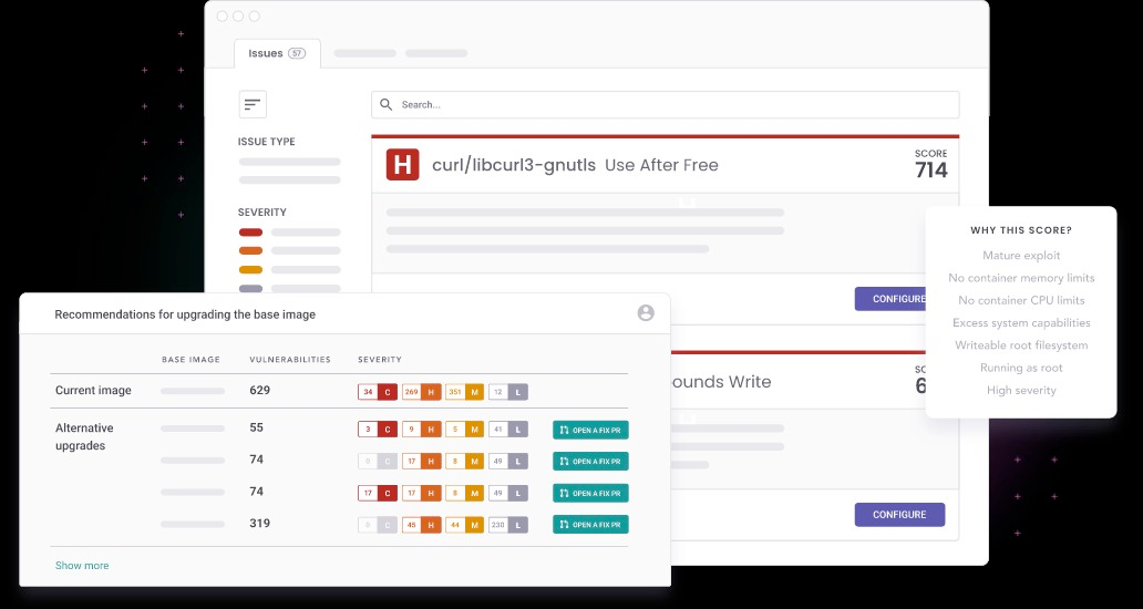 The first thing we tried is commercial software. There are a few available, such as Snyk. They offer many tools to find vulnerabilities in code, dependencies, containers, and infrastructure as code (IaC). Security experts qualify each vulnerability to help you prioritize the fix.