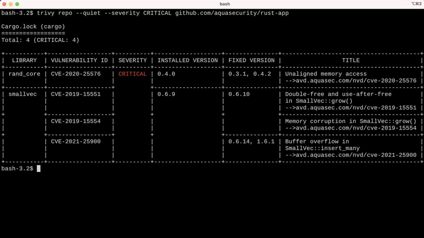 We stumbled upon Trivy, which is yet another vulnerability scanner called. It isn't any better than other scanners. As I said, some public databases reference common vulnerabilities, so the value is not there. There are a lot of good scanners.
