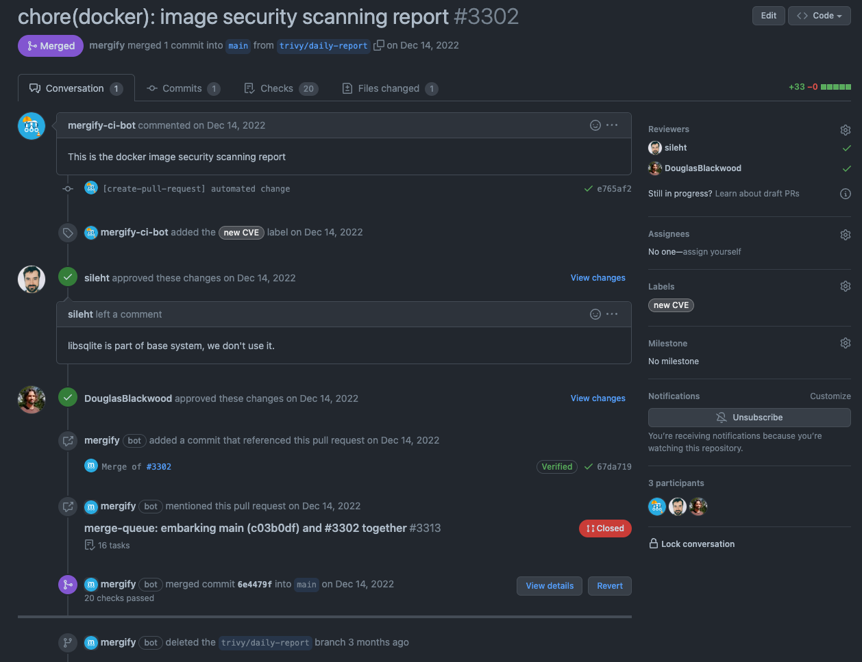 method: mergeThat's it! While the team must review every new vulnerability, boring tasks are automated. This gives more time for engineers to investigate each new CVE, leave a comment, approve it if it isn't considered a valid threat, or find a fix. The vulnerability lifecycle is handled correctly and is not affected by events such as a base image update.