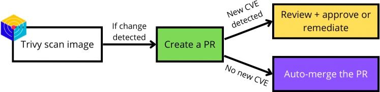 - If new CVEs are detected, label the pull request as such and wait for humans to either: a. fix the image by removing the vulnerability or b. approve the pull request and acknowledge the introduction of those new CVEs.