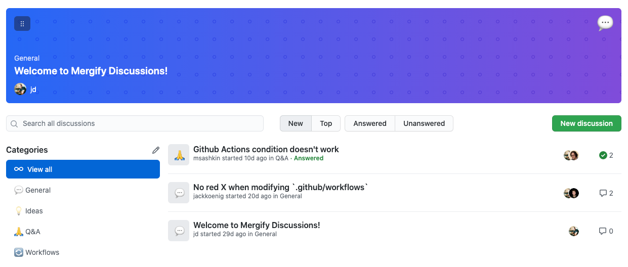 We have launched our Discussions page on GitHub, meaning you can now ask questions and chat about Mergify easily. We're excited to see what will be shared here: workflows, new features, etc.