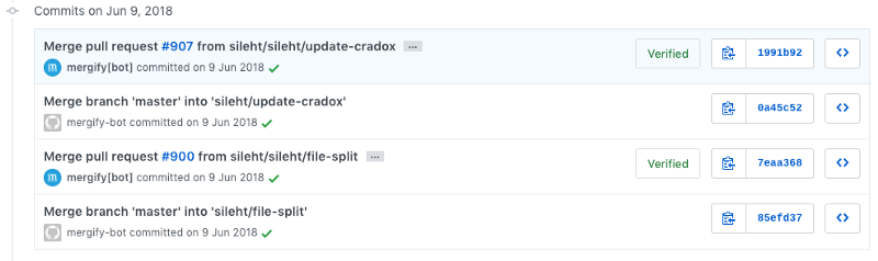 Each time the pull request is a candidate to be merged, Mergify merges the target branch inside the pull request to be sure the pull request is up-to-date. This creates a merge commit that you can see in the pull request timeline: