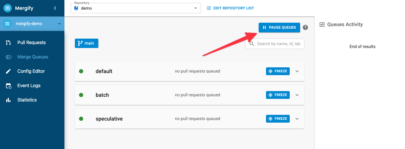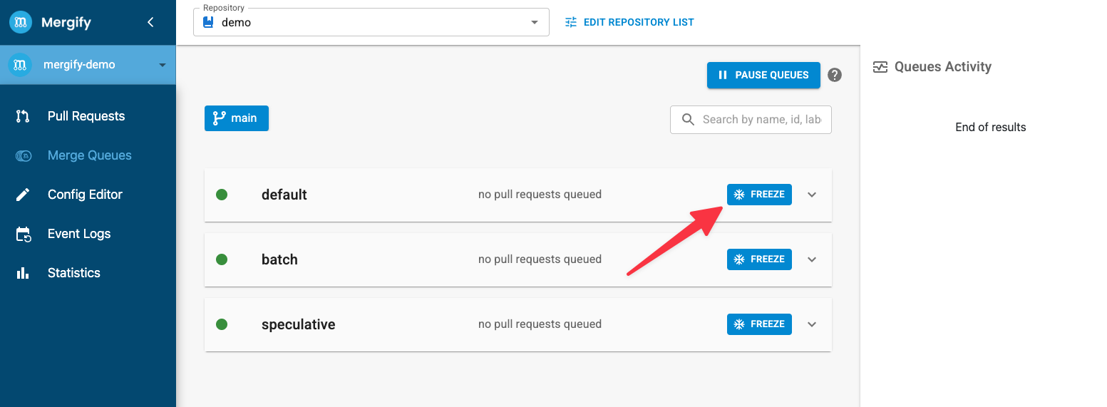 Mergify's Queue Freeze function allows you to freeze one or several merge queues simultaneously. This halts merging while other processes like checks and CI continue to work.
