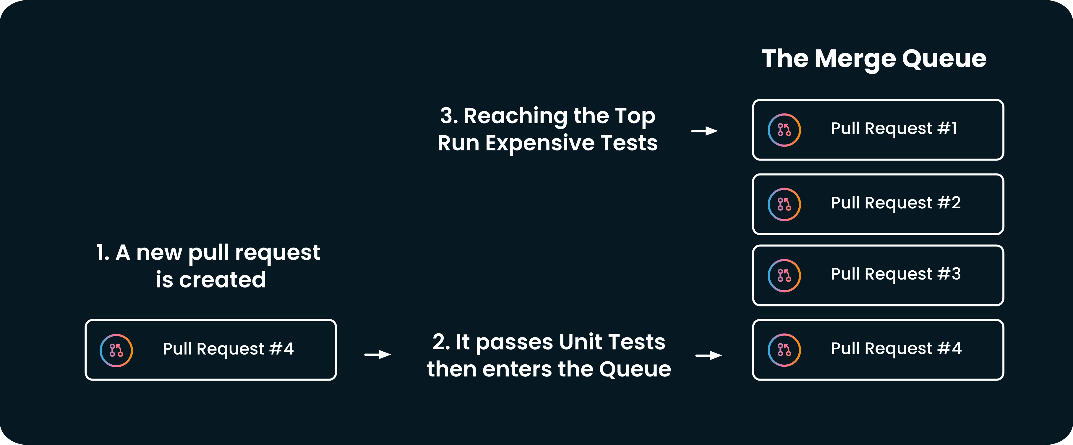 When a pull request is created, it only runs the unit tests. If they pass, the pull request will be included in the merge queue. Once it's at the top of the queue, it's time to go: just after being rebased, this is the best time to launch your longest and most expensive tests (functional tests, end-to-end tests...).