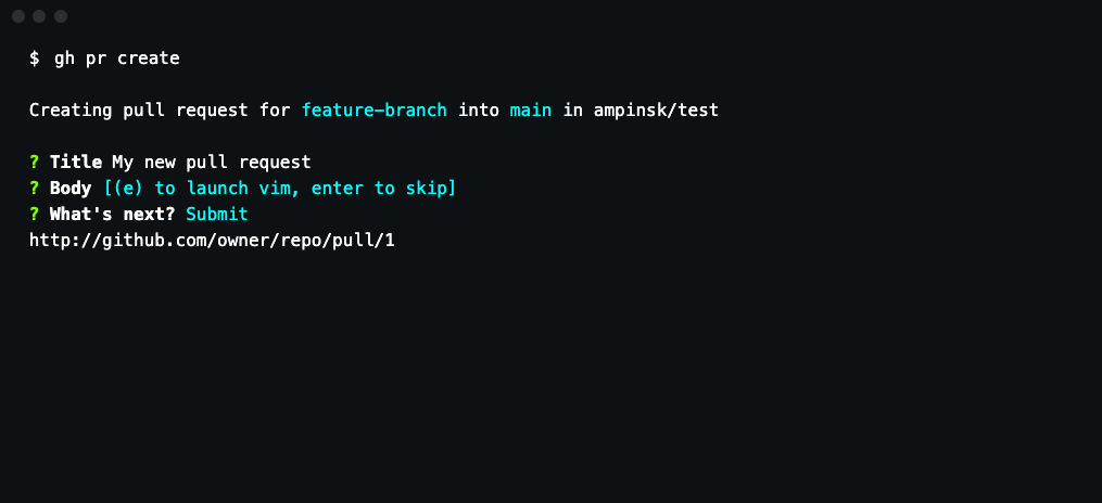 $ gh pr create --title "feat: my_super_feature" --body "all the details"