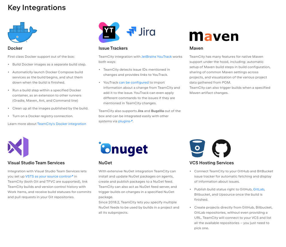 Integration is key in a modern CI workflow, and TeamCity excels in this aspect. It seamlessly integrates with a wide range of tools and technologies commonly used in software development. This includes popular version control systems (e.g., Git, Subversion), build tools (e.g., Maven, Gradle), testing frameworks (e.g., JUnit, NUnit), code analysis tools (e.g., SonarQube, ReSharper), and deployment platforms (e.g., AWS, Azure). TeamCity's extensive integration capabilities ensure that your CI process remains connected and aligned with your preferred development stack, promoting efficient collaboration and enabling end-to-end automation.