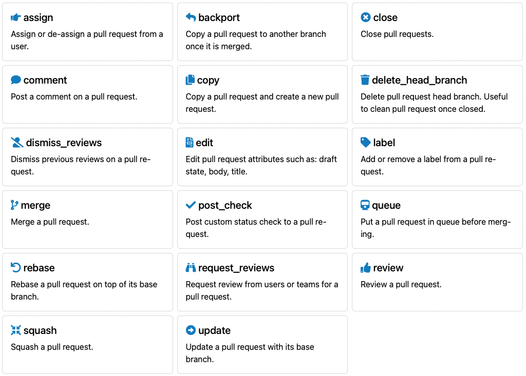 The automatic merge based on the two labels I mentioned earlier, as well as commands. The most popular one is “@mergify rebase” and the next is “@mergify backport”.