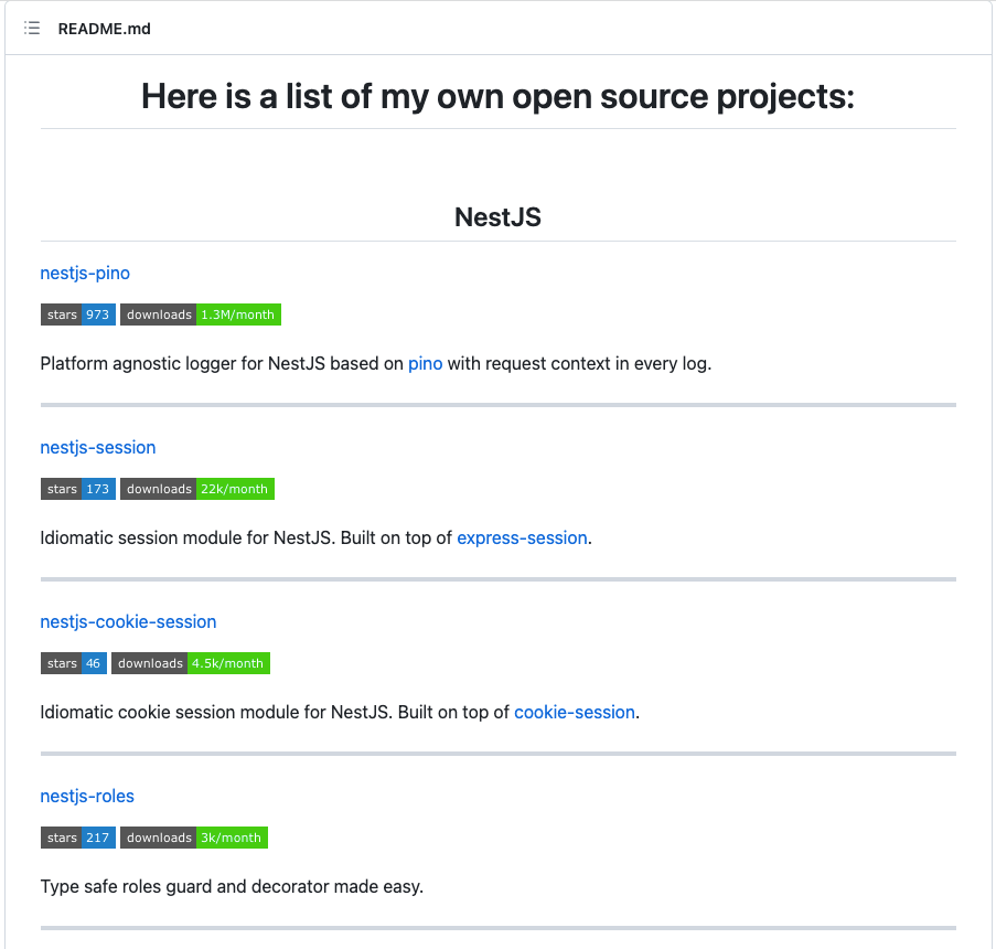 I mainly work on NestJS, React Native and GO, developing modules. Some of them are quite successful for its audience. For example nestjs-pino (a platform agnostic logger for NestJS based on pino with request context in every log) is downloaded over a million times a month.