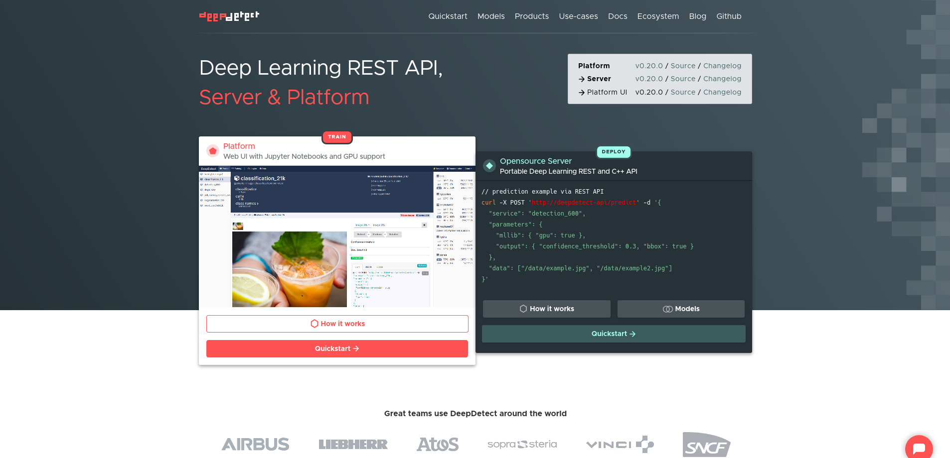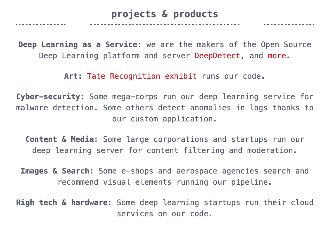 One of our main projects is DeepDetect, a server written in C++ where we can train deep learning models and then use them in production using the same pipeline. We coded this software soon after the creation of the company to accelerate the development of projects with our customers because we realized pretty quickly that it was possible to reuse stuff among projects due to the versatility of machine learning. DeepDetect supports machine learning backends such as Caffe, TensorFlow, PyTorch, XGBoost, t-SNE, and Faiss. And we can use it for lots of different tasks, including implementing support for supervised and unsupervised deep learning of images, text, time series, and other data, and it supports classification, object detection, segmentation, regression, and autoencoders. And as it is open-source, anybody can use it!