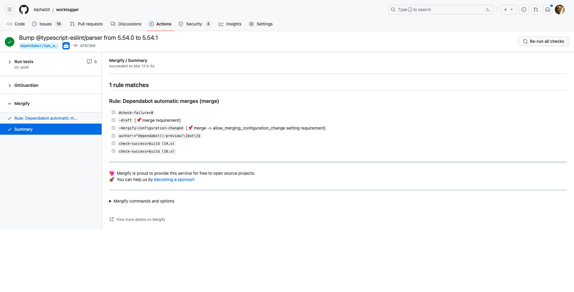 Mergify runs the tests on a PR; if the tests pass, everything works correctly, and the author is Dependabot, Mergify automatically merges the PR.