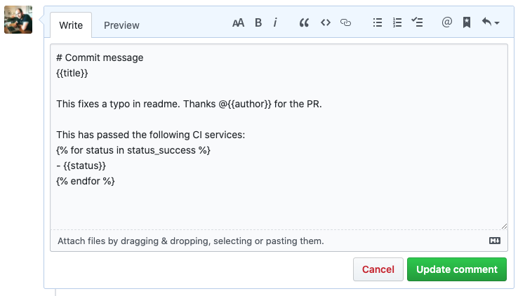 Here come the dynamic commit messages, powered by templates. You can now write the final commit message for your pull request in the pull request body. Use the markdown header Commit Message and write down the title of the commit message and its content.