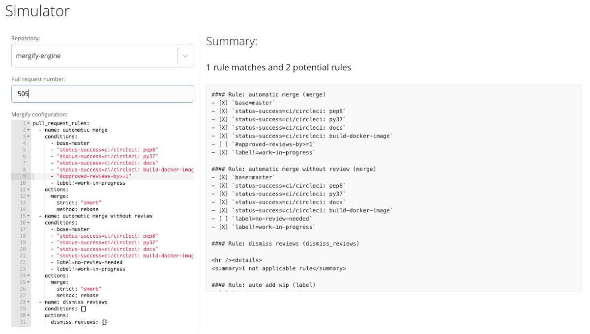 Our master piece is now online. Dubbed Simulator, it allows you to test your rules on your pull requests before merging them in your configuration file.
