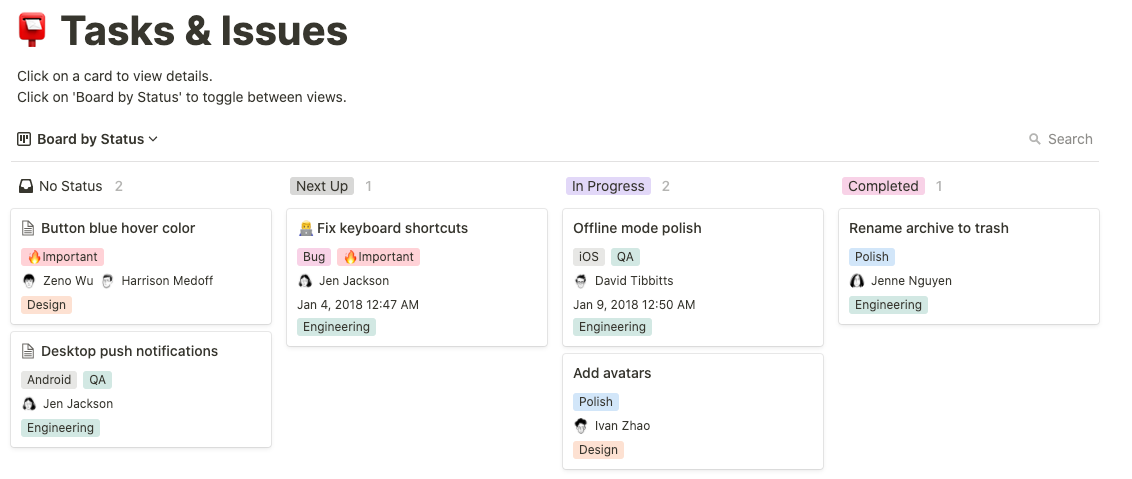 If you feel uninspired, Notion has plenty of templates. They offer their version of the Task & Issues board that you can duplicate and use as a starting point.