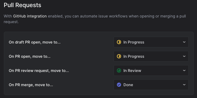 Plus, Linear natively integrates itself with GitHub. Any pull request created with the right branch name or including the Linear issue code in its body will see its status changed in the Linear board.